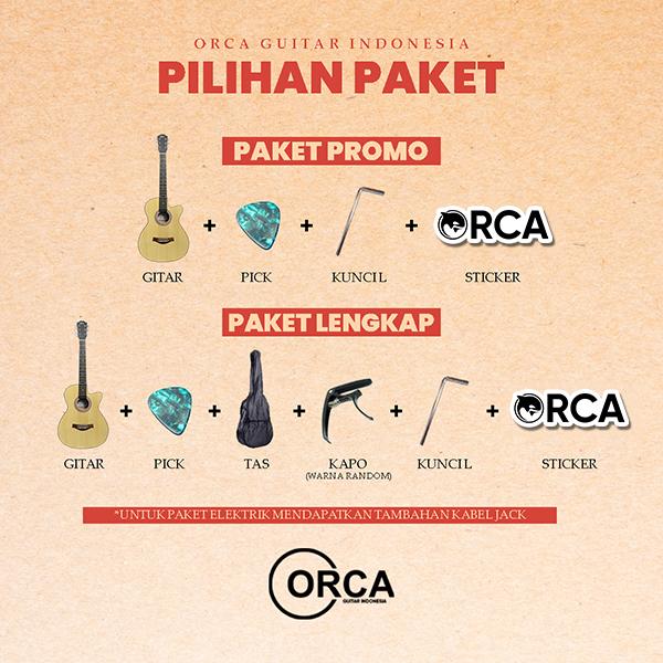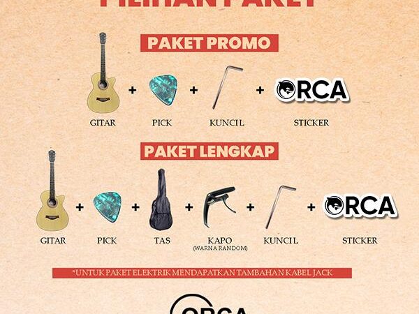 | Paket Promo | 1x Gitar ORCA VT09, 1x Kunci L, 1x Pick Gitar, 1x Sticker ORCA | Harga terjangkau, cocok untuk pemula. |