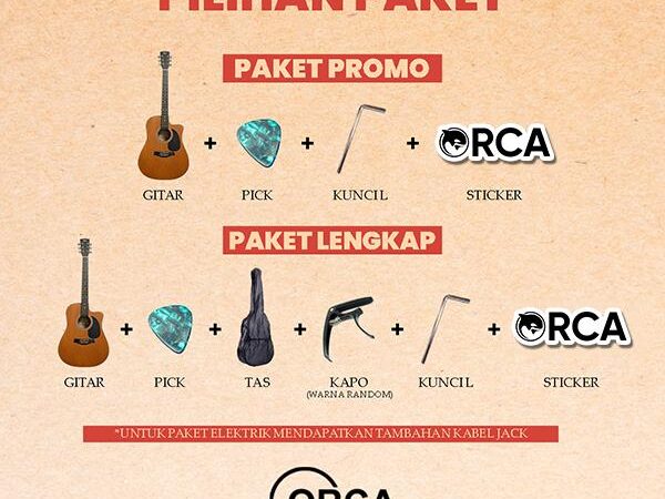 | Paket Promo | 1x Gitar SC10, 1x Kunci L, 1x Pick, Sticker ORCA | Free packing kayu & kardus tebal, aman dikirim |