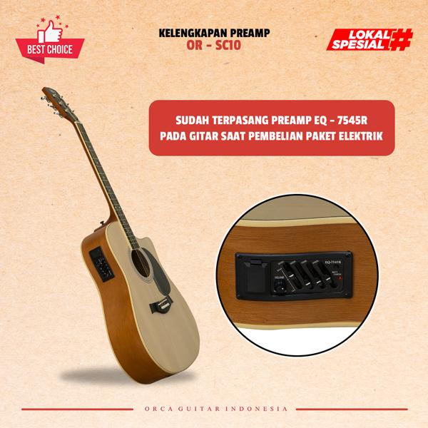 | Paket Promo Elektrik | 1x Gitar SC10, 1x Kunci L, 1x Pick, Sticker ORCA, 1x Preamp 7545R (terpasang), 1x Kabel Jack | Siap dipakai untuk pertunjukan atau rekaman |