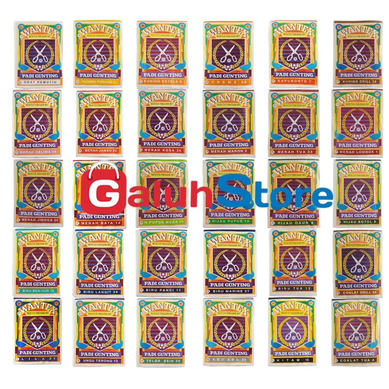 - Pewarna Pakaian: Produk yang digunakan untuk memberikan warna pada kain atau tekstil. Padi Gunting Wantex merupakan jenis pewarna yang diaplikasikan dengan proses tertentu (biasanya direbus) untuk mewarnai seluruh bagian pakaian secara merata.