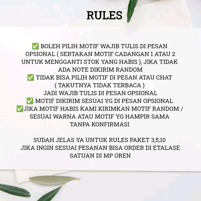 | Bahan | Katun import grade A (softcotton), lembut, anti luntur, dan tidak kaku. |