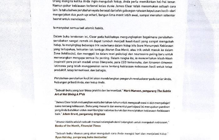 Atomic HabitsUbah kebiasaan buruk menjadi rutinitas produktif dengan metode bertahap yang terbukti efektif. Raih versi terbaik dirimu.