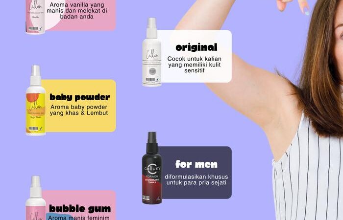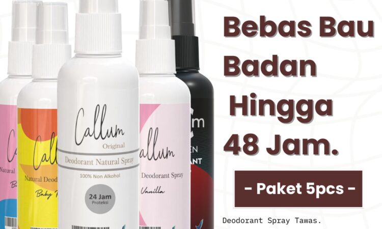 Dapatkan paket hemat 5 pcs Deodorant Spray Callum dengan harga spesial! Pilihan aroma yang tersedia: Original (tanpa wangi), Baby Powder, Bubblegum, Vanilla, dan varian khusus For Men.
