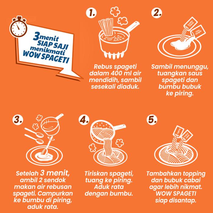 Nikmati kelezatan spageti ala restoran dalam hitungan menit dengan Wow Spageti! Spageti instan ini menggabungkan cita rasa premium dan kepraktisan, cocok untuk Anda yang ingin menikmati hidangan lezat tanpa ribet.