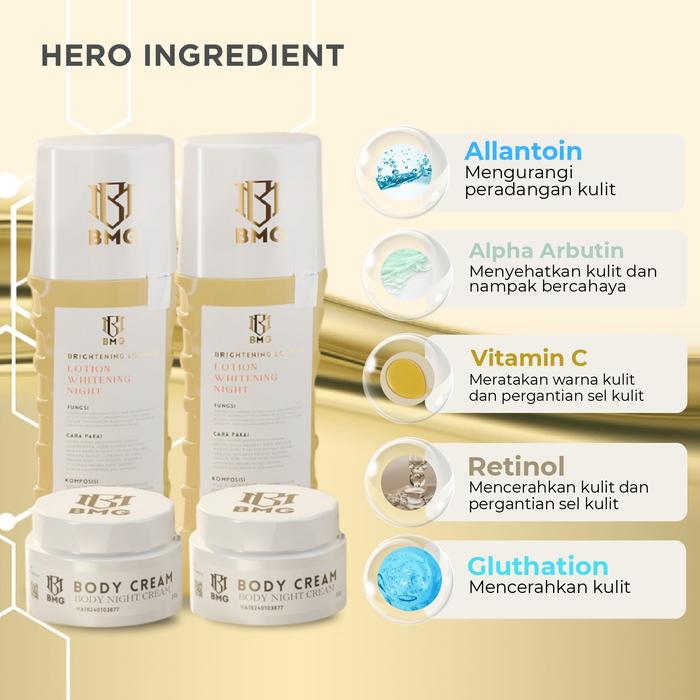 | Body Night Cream | NA18240103877 | Allantoin, Alpha Arbutin, Glutathione, Retinol | Mencerahkan, menutrisi, mengurangi radikal bebas, melembutkan, memperbaiki tekstur |