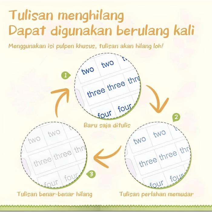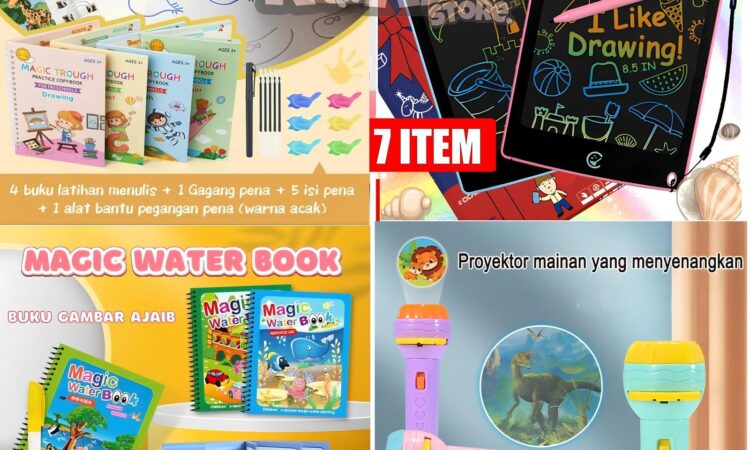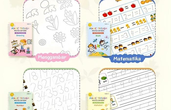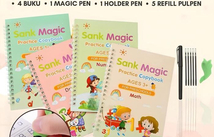 | Paket Dasar | 5 Item | 4 Buku Belajar (Alphabet, Math, Drawing, Number), Pulpen + Holder + Isi Ulang, Buku Gambar Ajaib + Spidol Air | Fokus pada buku belajar dan gambar reusable |