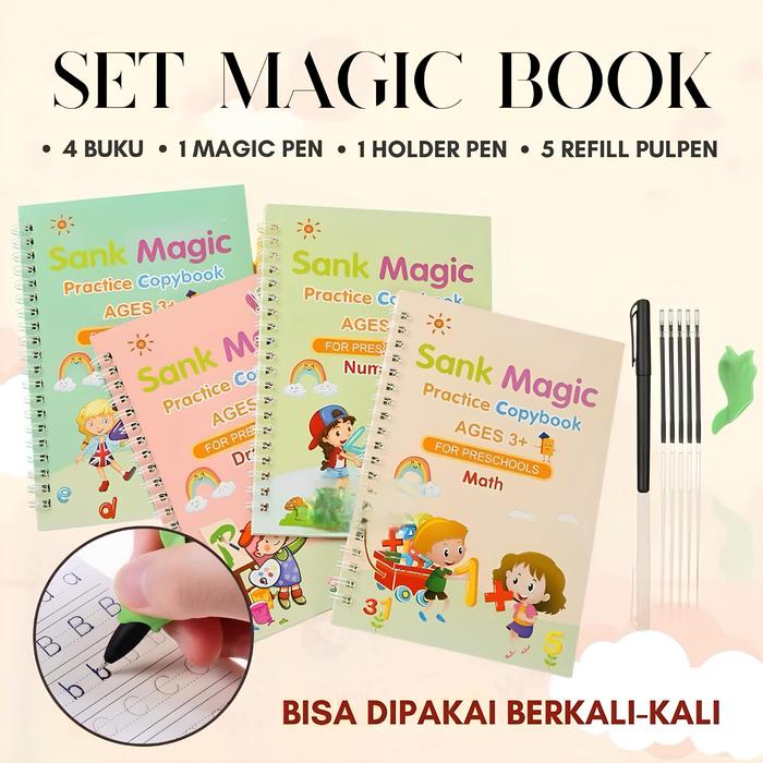 | Paket Standard | 6 Item | 4 Buku SANK Magic Book (Alphabet, Math, Drawing, Number), Pulpen + Holder + Isi Ulang, LCD Tablet, Buku Gambar Ajaib + Spidol Air | Termasuk LCD tablet untuk menulis dan menggambar |