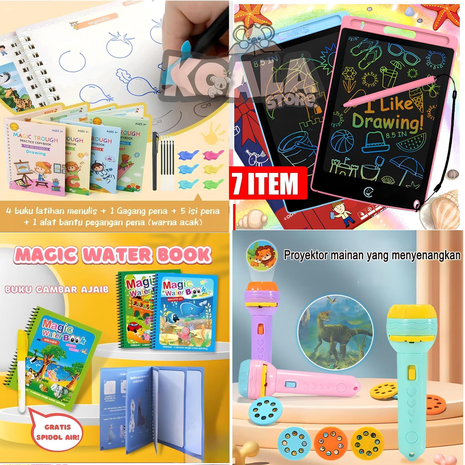 | Paket Hemat | 7 Item | 4 Buku SANK Magic Book (Alphabet, Math, Drawing, Number), Pulpen + Holder + Isi Ulang, Senter Proyektor + 24 Gambar, LCD Tablet Warna, Buku Gambar Ajaib + Spidol Air | Paling Lengkap dengan senter proyektor dan LCD tablet warna |