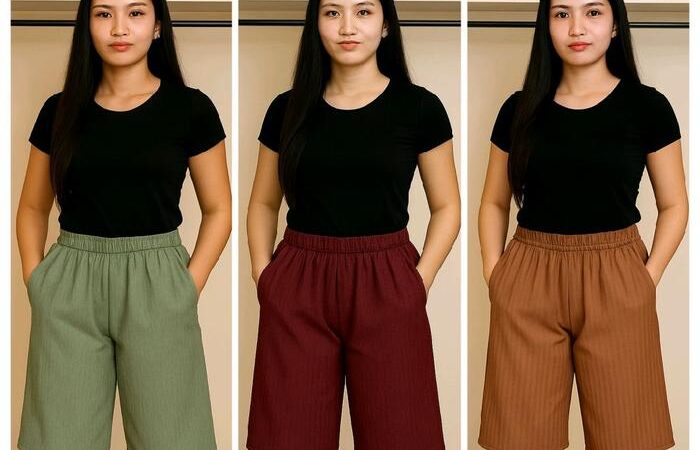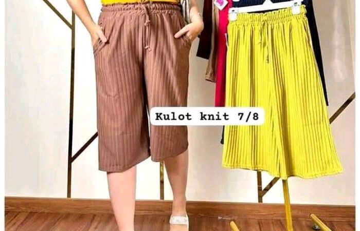 - Kulot: Model celana wanita yang memiliki bentuk kombinasi antara skirt dan celana, biasanya longgar di bagian paha dan menyempit di bagian bawah.