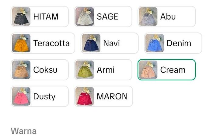 Dapatkan pilihan warna terkini yang ready untuk semua ukuran: Hitam, Dusty Pink, Cream, Sage, Denim, Navy, Teracotta, Maroon, Army, Coksu, Abu Tua, dan Lemon. Bahan halus dan lembut membuatnya cocok dipakai untuk aktivitas sehari-hari, mulai dari kerja hingga bersantai.