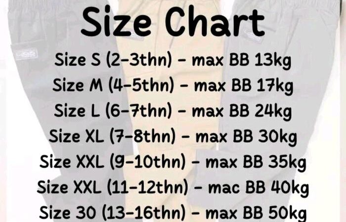 | Size | Usia (Tahun) | Berat Badan (BB) | Panjang Celana |