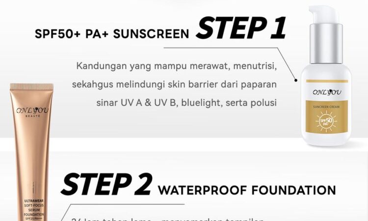 | ONLYOU Sunscreen Cream | • SPF50+ PA+ • Tekstur ringan & cepat menyerap • Fungsi: Primer makeup + Tabir surya + Pelembap. |