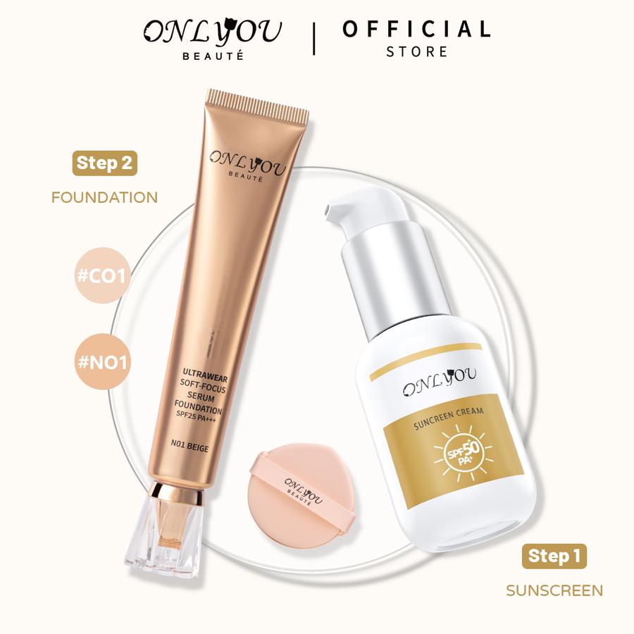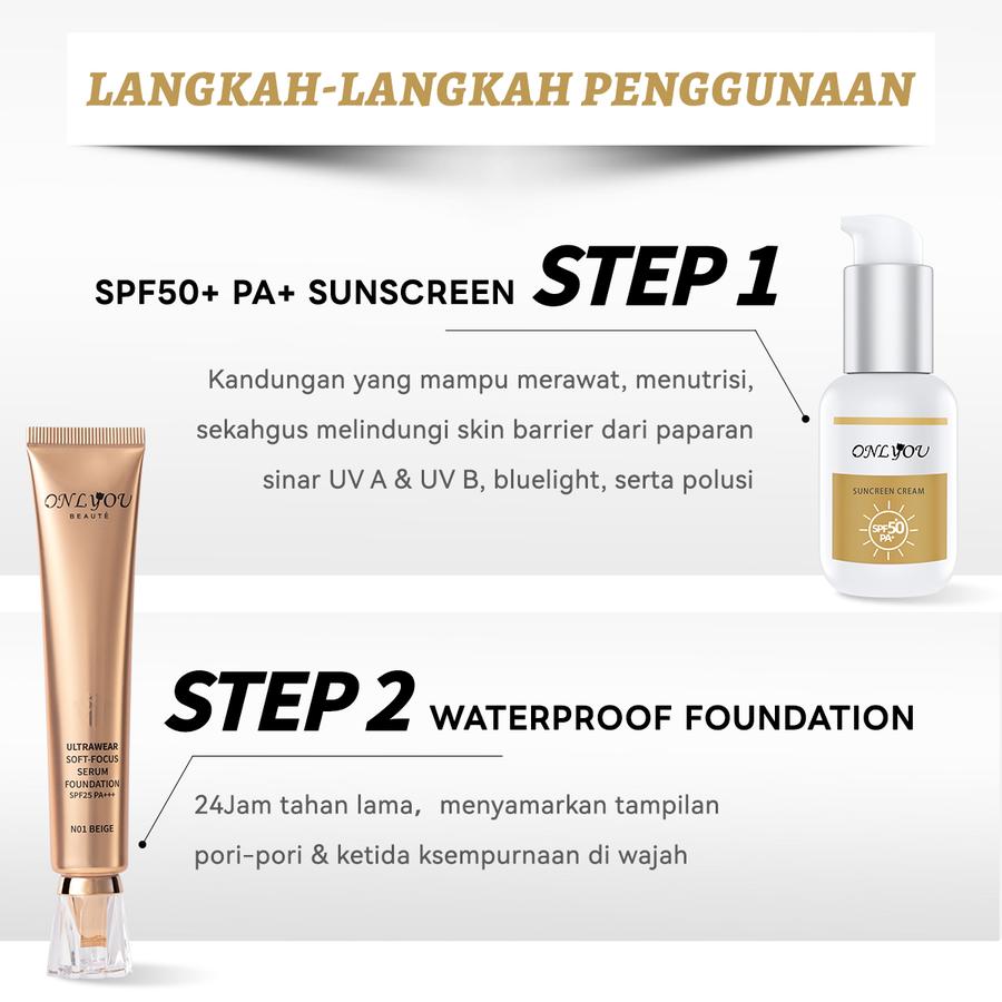 | ONLYOU Sunscreen Cream | • SPF50+ PA+ • Tekstur ringan & cepat menyerap • Fungsi: Primer makeup + Tabir surya + Pelembap. |