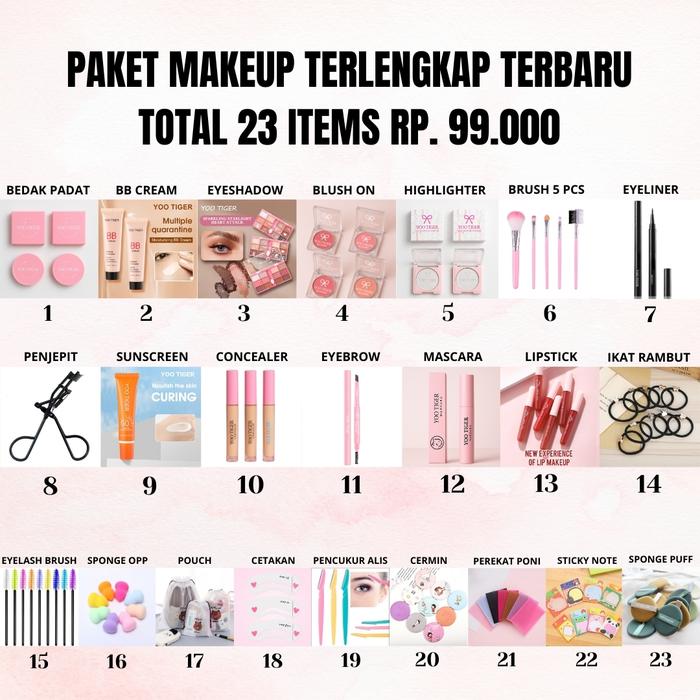 Dapatkan koleksi makeup lengkap dengan 23 item premium untuk tampilan flawless! Paket ini dirancang untuk memenuhi semua kebutuhan riasan harian maupun spesial Anda.