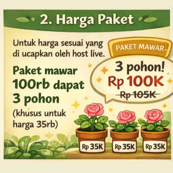 Hadirkan keindahan instan di taman Anda dengan Paket Mawar Dewasa Bunga Jocelyn. Tanaman mawar import usia 1 tahun ini telah melalui masa pertumbuhan kritis, menjadikannya lebih kuat, sehat, dan siap memancarkan pesona bunga-bunga cantiknya. Dibudidayakan dari bibit pilihan berkualitas tinggi, setiap tanaman memiliki batang kokoh, daun hijau segar lebat, serta sistem perakaran yang sudah mapan untuk hasil optimal.