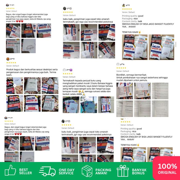 | English Booster | Kumpulan soal latihan grammar dan reading comprehension dengan pembahasan detail untuk memperdalam pemahaman. | Mereka yang ingin menguji kemampuan atau persiapan tes bahasa Inggris. |