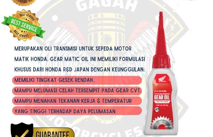 - Oli Gardan: Oli khusus untuk melumasi bagian gardan (differential) pada motor matic. Fungsinya mengurangi gesekan dan mencegah keausan pada komponen transmisi akhir.