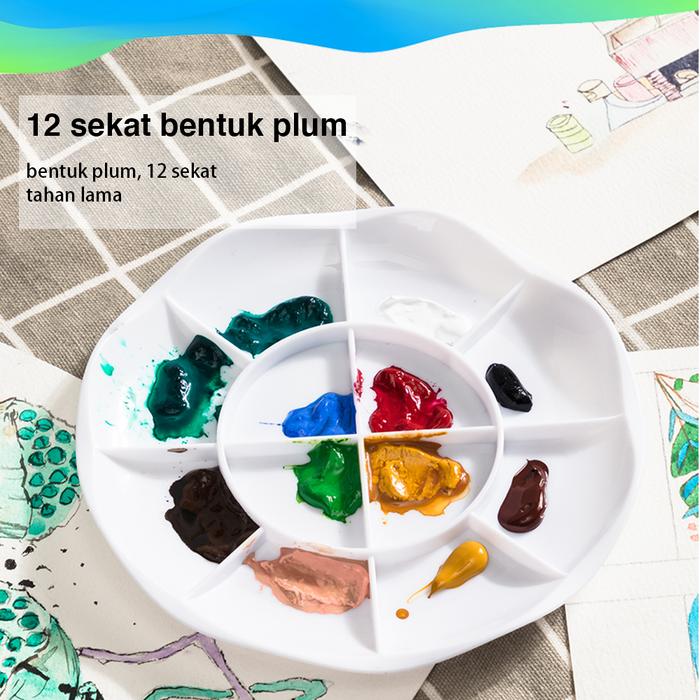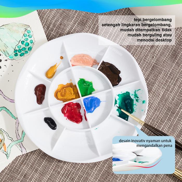 Palet ini didesain khusus untuk memberikan pengalaman melukis yang lebih baik. Desain pinggirnya yang bergelombang berfungsi mencegah kuas tergelincir dan jatuh, sehingga Anda dapat fokus sepenuhnya pada proses berkreasi. Ringan dan mudah dibawa ke mana saja, palet ini sangat praktis untuk digunakan di studio maupun di luar ruangan. Sekat yang luas memudahkan Anda untuk mencampur warna dengan sempurna tanpa takut tumpah. Cocok untuk pelajar, pemula, maupun profesional yang menginginkan alat yang fungsional dan dapat diandalkan untuk setiap proyek seni mereka.