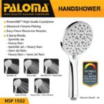 Tingkatkan pengalaman mandi Anda dengan Paloma HSP 1502 Hand Shower. Dibuat dari material PowerABS copolymer grade tertinggi yang baru dan virgin (bukan daur ulang), menjadikannya sangat padat, keras, serta tahan terhadap pecah, keropos, karat, dan korosi. Finishing Diamond Chrome Plating dengan teknologi electroplating menghasilkan lapisan ekstra tebal yang halus, jernih, dan menjamin keawetan maksimal.