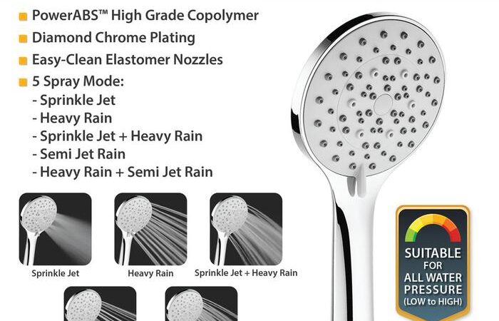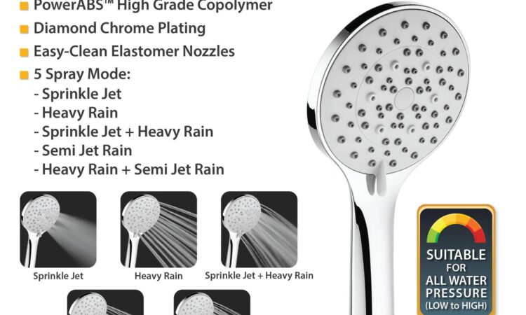 Titik-titik outlet airnya menggunakan silicon elastomer yang tidak akan mengeras atau menjadi getas seiring waktu, sehingga sangat mudah dibersihkan dari kerak dan kotoran. Hasilnya, semburan air selalu kuat dan konsisten. Dengan 5 mode spray yang variatif, Anda dapat menikmati berbagai sensasi mandi sesuai keinginan. Produk ini tahan terhadap suhu air panas tinggi dan tekanan air hingga 10 bar, dilengkapi dengan drat standar 1/2 inch untuk kemudahan pemasangan dan digaransi 1 tahun terhadap kebocoran.