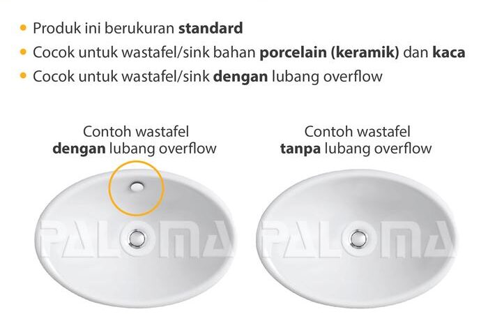 | Kompatibilitas | Khusus untuk wastafel porcelain/keramik atau kaca yang memiliki lubang overflow. Tidak cocok untuk wastafel stainless steel biasa. |