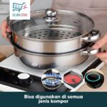 | • Material stainless steel food grade, anti karat, dan mudah dibersihkan | • 2 buah Tingkat Steamer | • Bebas BPA dan PFOA |