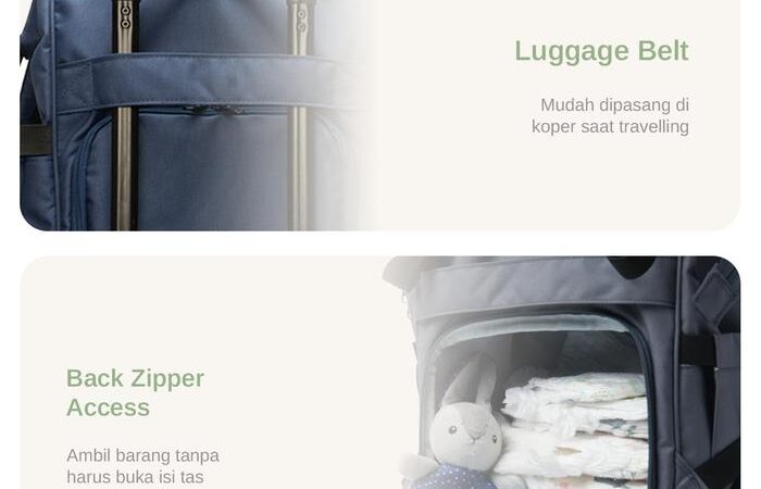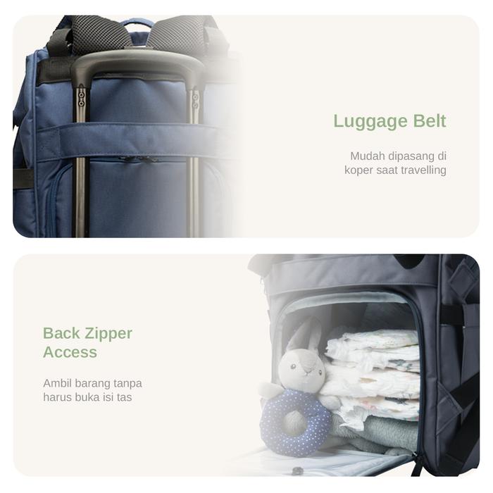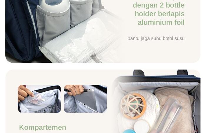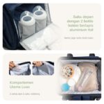 | Kompartemen & Organizer | 3 kompartemen utama dengan banyak sekat. Termasuk kompartemen khusus untuk 2 botol susu berlapis foil dan kantong tissue eksternal. |