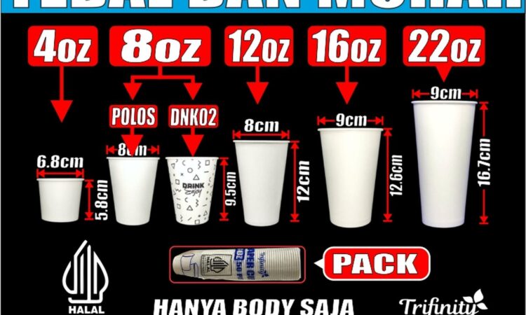 | Ukuran (oz/ml) | Gramatur (GSM) | Isi per Pack | Berat per Pcs (gr) | Tipe Laminasi | Keterangan |