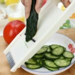 - Gerakkan bahan makanan mengikuti arah papan mata pisau hingga terpotong.