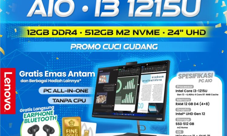Tampilkan performa profesional dengan PC Lenovo All-In-One pilihan. Dapatkan komputer siap pakai dengan prosesor Intel Core i3 atau i5 Generasi Terbaru, memori RAM hingga 16GB, dan penyimpanan SSD yang cepat. Layar 24″ jernih memberikan kenyamanan visual maksimal untuk pekerjaan sehari-hari. Setiap unit sudah dilengkapi dengan sistem operasi Windows dan Microsoft Office yang terinstal, sehingga Anda tinggal mencolokkan kabel daya dan mulai bekerja.