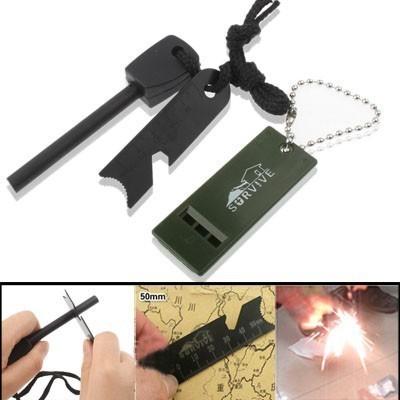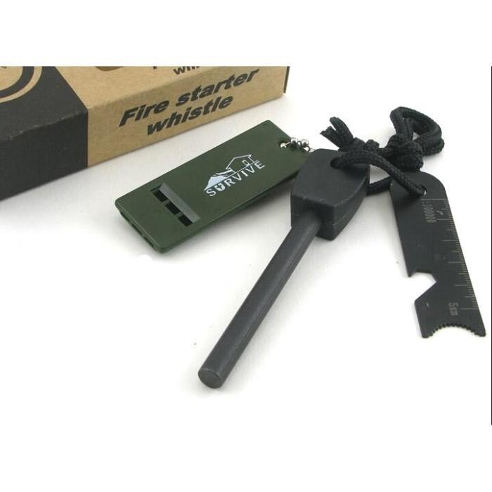 Konten Paket1x Batang Magnesium Flint, 1x Peluit Survival, 1x Besi Striker (untuk menggesek), dan penggaris EDC.