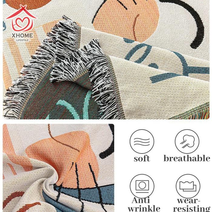 Selimut multifungsi ini terbuat dari material kain katun dan poliester yang padat serta tahan lama. Memiliki daya serap kelembapan yang luar biasa, membuatnya nyaman digunakan langsung pada kulit dan cocok untuk segala musim. Desainnya yang sederhana dengan fringe (rumbai-rumbai) mengusung gaya Skandinavia yang populer dan elegan, mudah dipadukan dengan berbagai gaya interior ruangan.