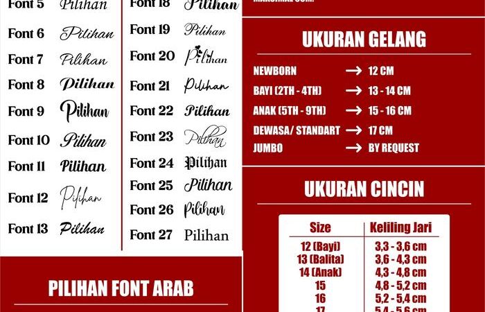 | Keunggulan | Warna tidak luntur, tahan lama, anti karat, dan bisa disepuh ulang. Bebas custom font & aksen. Free box kekinian. |
