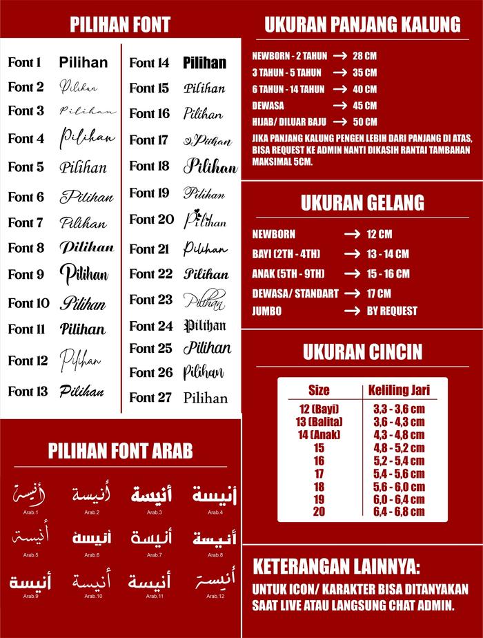 | Bahan Liontin | – Kuningan: Warna kuning kinclong, liontin lapis kuningan import – Lapis Putih: Warna putih berkilau, liontin lapis kuningan import – Silver: Warna logam metalik, liontin dari Stainless Steel |