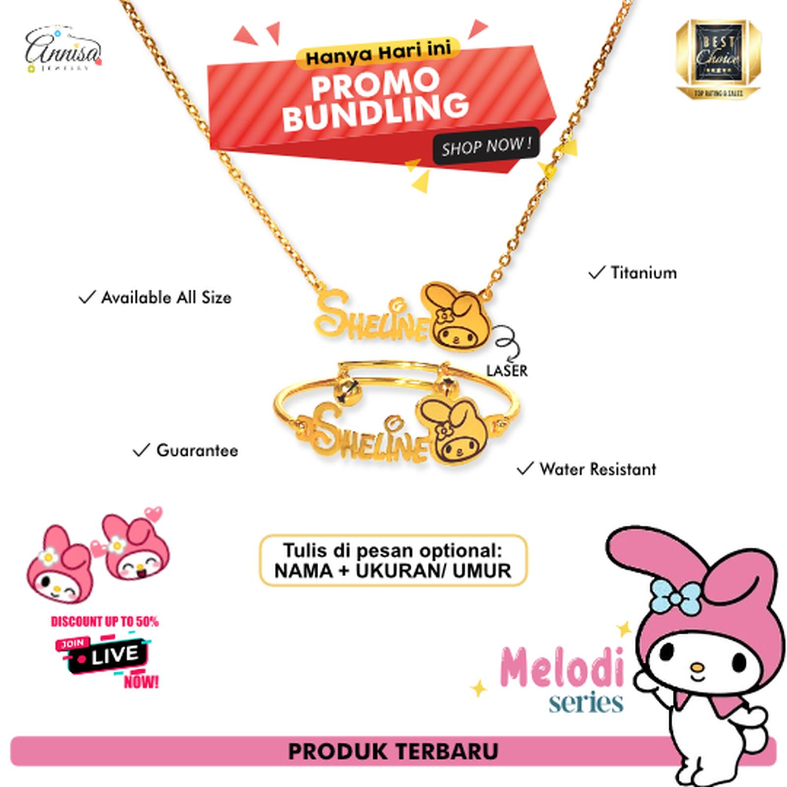 - Laser Melodi Series: Seri produk perhiasan dimana nama diukir menggunakan teknologi laser untuk hasil yang presisi dan rapi, seringkali pada liontin yang dapat diputar (melodi).