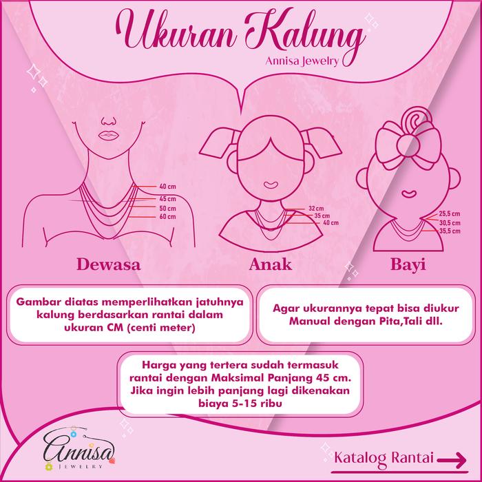 Extra rantai (hingga 60cm) tersedia mulai Rp 10.000. Katalog model rantai (10+ pilihan) dapat dilihat di foto toko atau tanyakan ke admin. Pengiriman dari Jepara, Jawa Tengah.