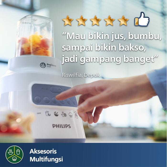- ProBlend Crush Technology: Sistem pisau dan motor canggih Philips yang dirancang untuk menghancurkan bahan keras secara optimal.