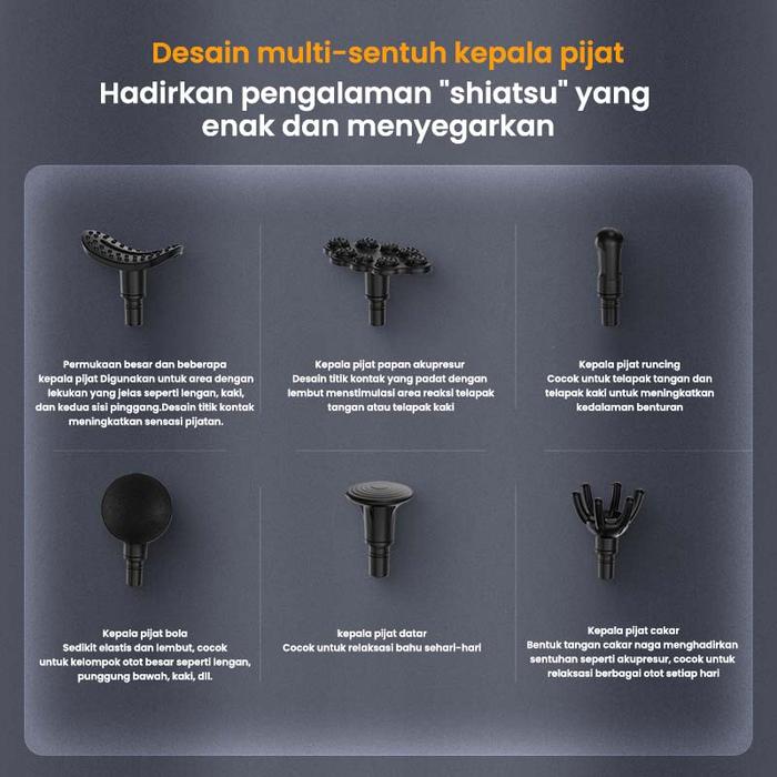 | Kepala Pijat Serbaguna | 6 kepala pijat somatosensori dengan bentuk berbeda untuk berbagai jenis otot dan kebutuhan pemulihan. |