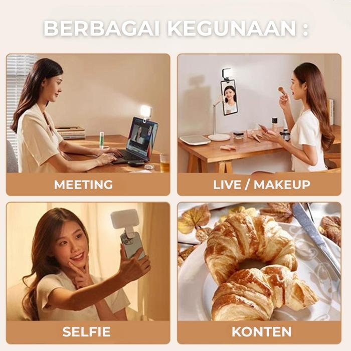 Cocok digunakan sebagai lampu selfie, lampu isi untuk rekaman video vlog, pencahayaan makeup, atau bahkan sebagai lampu tidur yang nyaman. Dapatkan pencahayaan profesional tanpa perlu peralatan mahal.