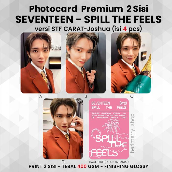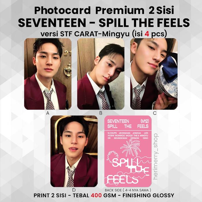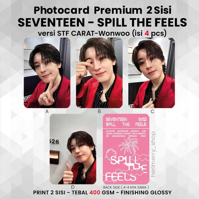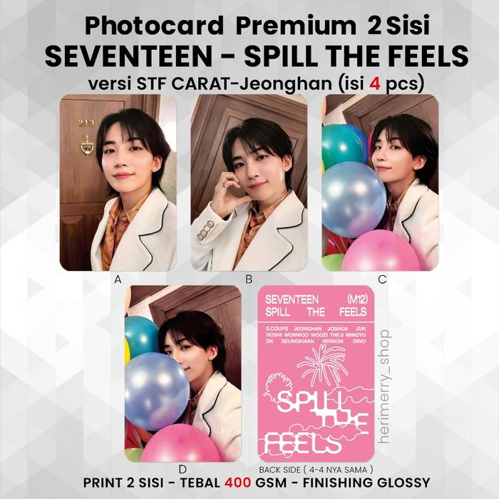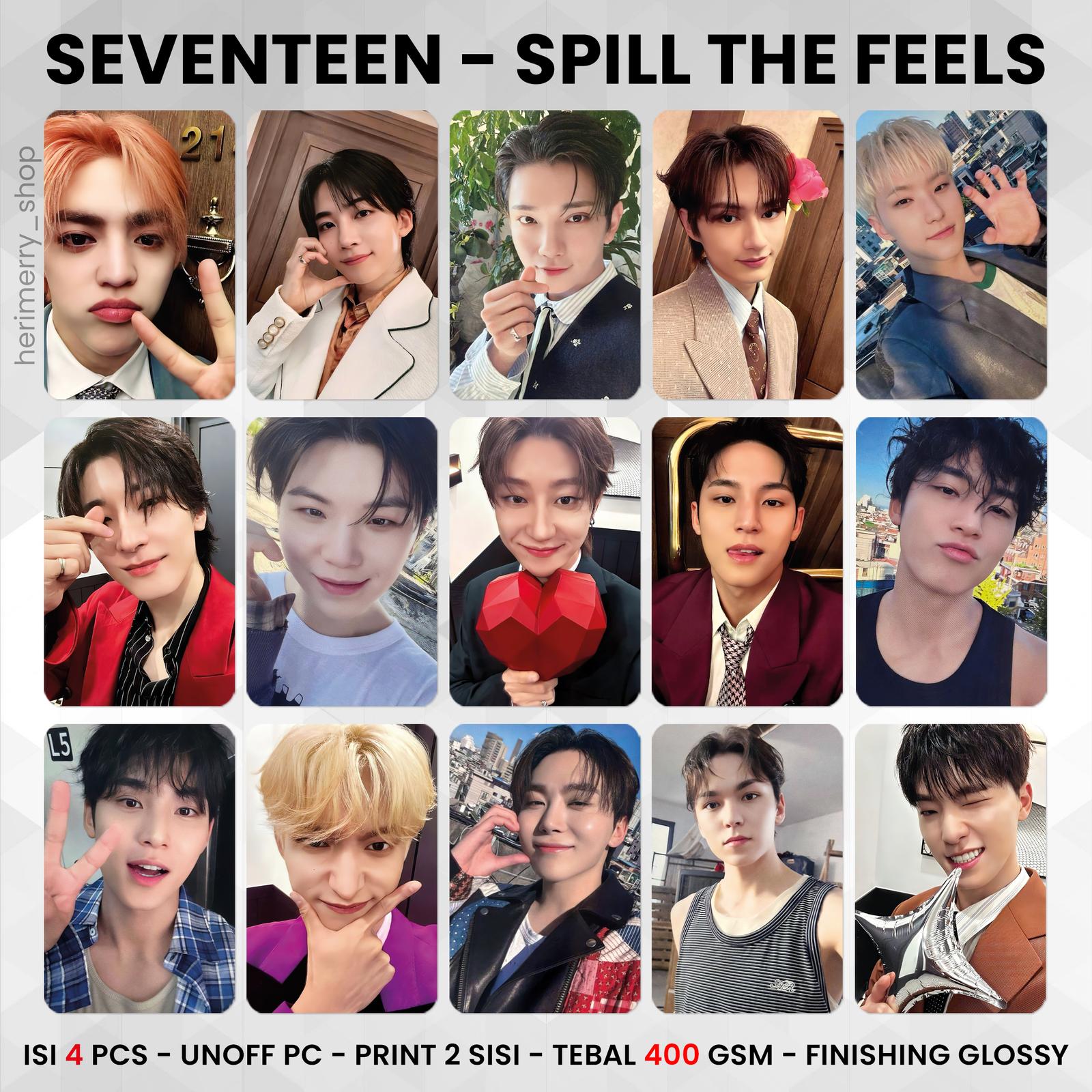Dapatkan koleksi lengkap photocard SEVENTEEN era Spill The Feels yang mencakup semua konsep: Love, Money, Fame, dan Eyes On You. Satu set berisi 4 pcs photocard dengan harga yang sangat terjangkau untuk melengkapi koleksi Anda. Tersedia pilihan 26 versi yang berbeda dari seluruh member.