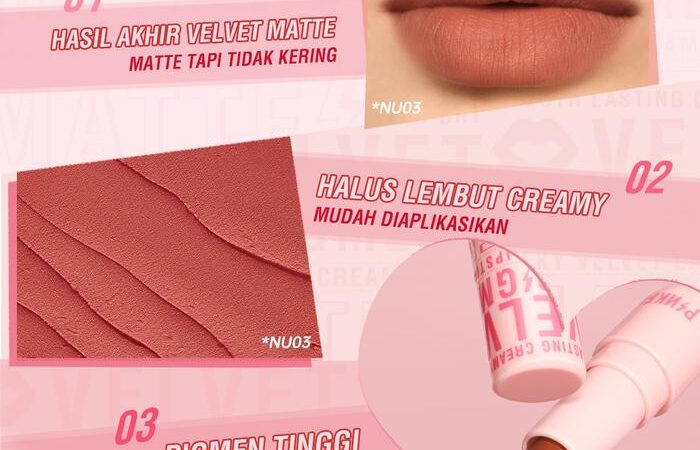 • Velvet Matte: Finis matte pada lipstik yang memiliki tekstur halus dan lembut seperti beludru, tidak flat matte yang cenderung kaku dan kering.