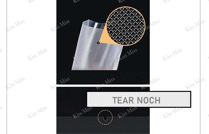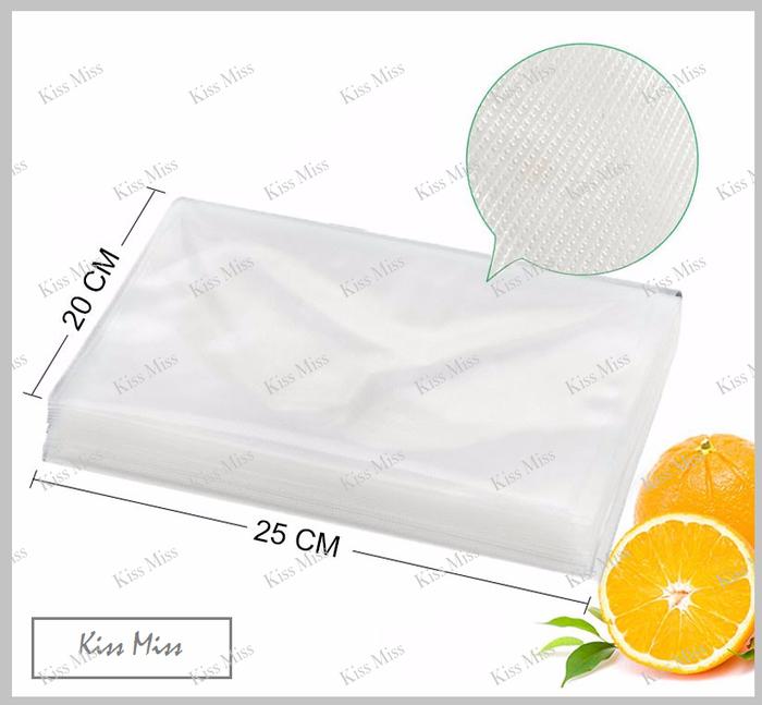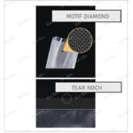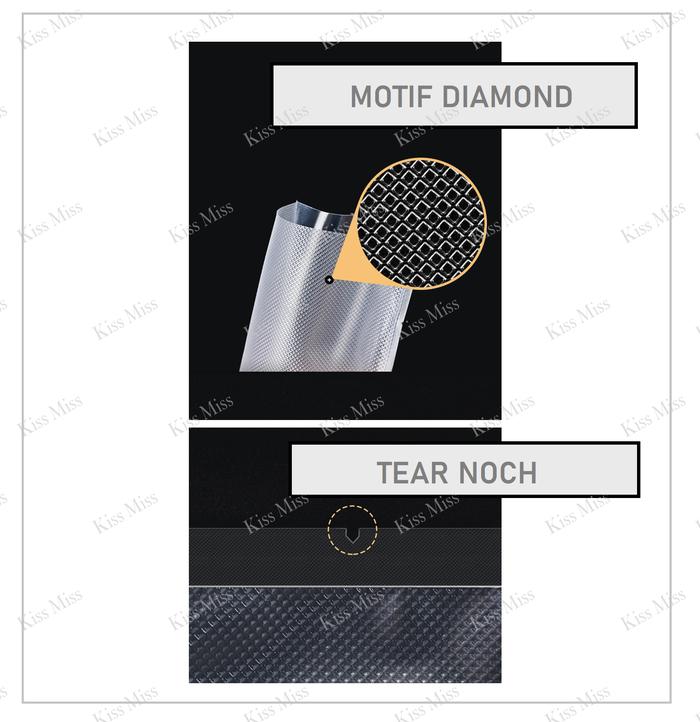 - Emboss Diamond: Tekstur permukaan plastik berbentuk pola berlian yang berfungsi menciptakan jalur udara untuk memaksimalkan proses penyedotan oksigen selama sealing.