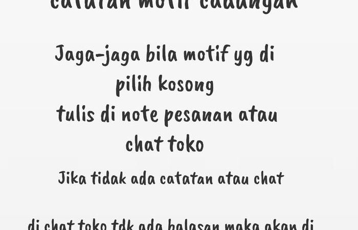 - Pemilihan Motif: Motif yang dipilih adalah satu sisi. Sisi sebaliknya adalah random. Selalu sertakan pilihan motif cadangan di catatan pemesanan.
