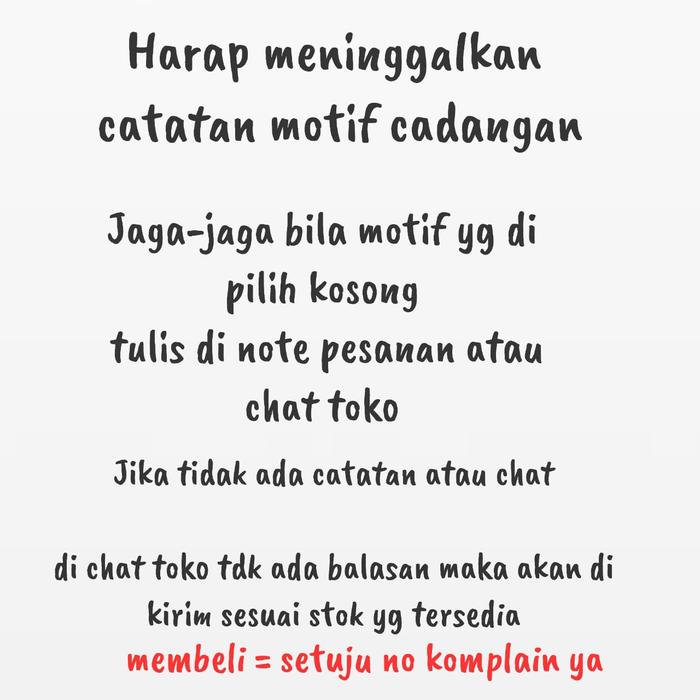 - Pemilihan Motif: Motif yang dipilih adalah satu sisi. Sisi sebaliknya adalah random. Selalu sertakan pilihan motif cadangan di catatan pemesanan.