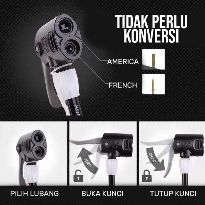 | Dual Valve | Mendukung kedua jenis pentil: Schrader (standar motor/mobil) dan Presta (sepeda). |