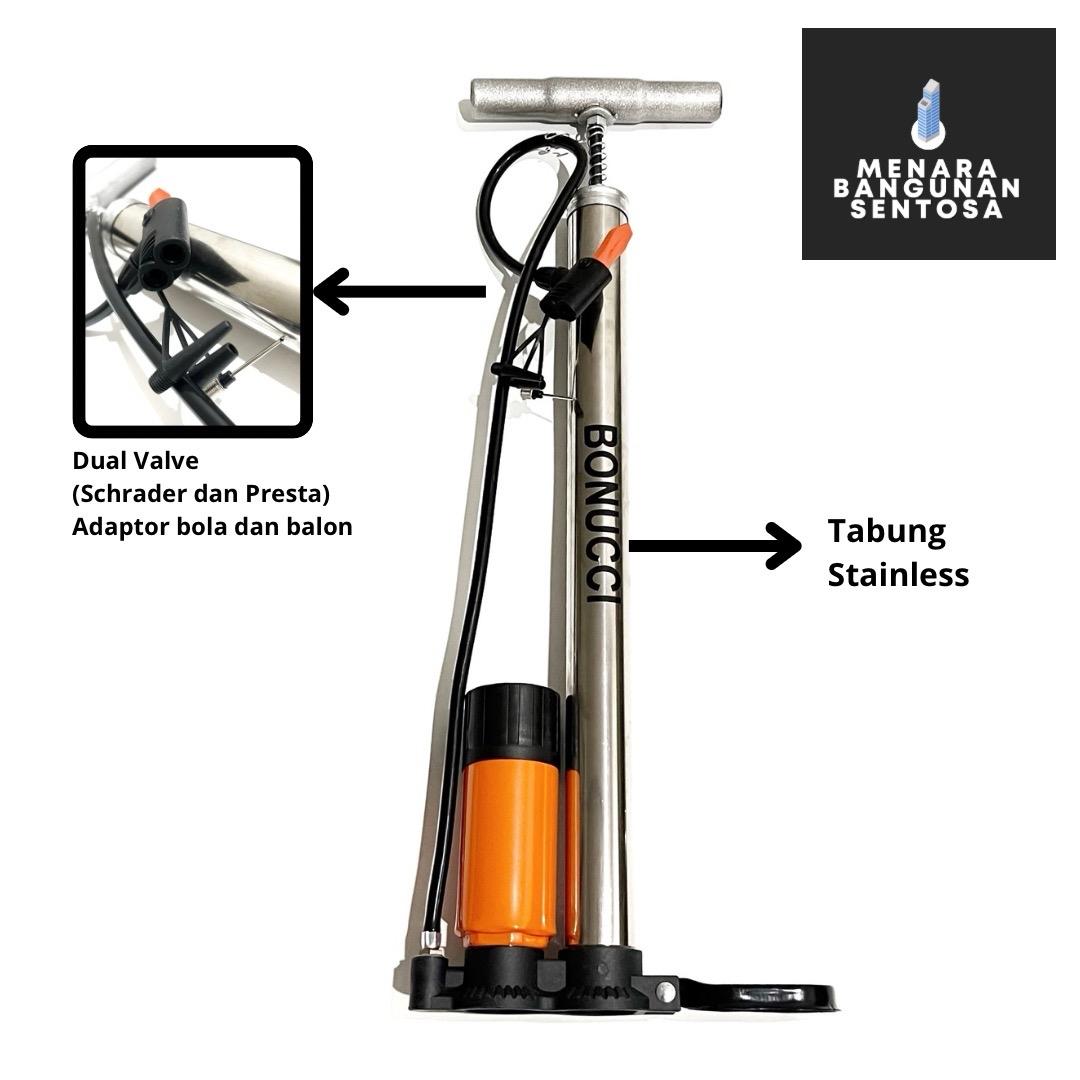 | Gagang Besi Bonucci | Stainless | PVC ABS | Dual valve (Schrader & Presta), adaptor bola & balon, dasar tidak mudah patah. | 60 cm |