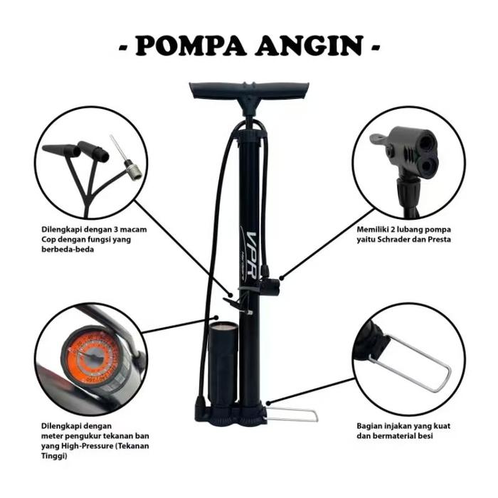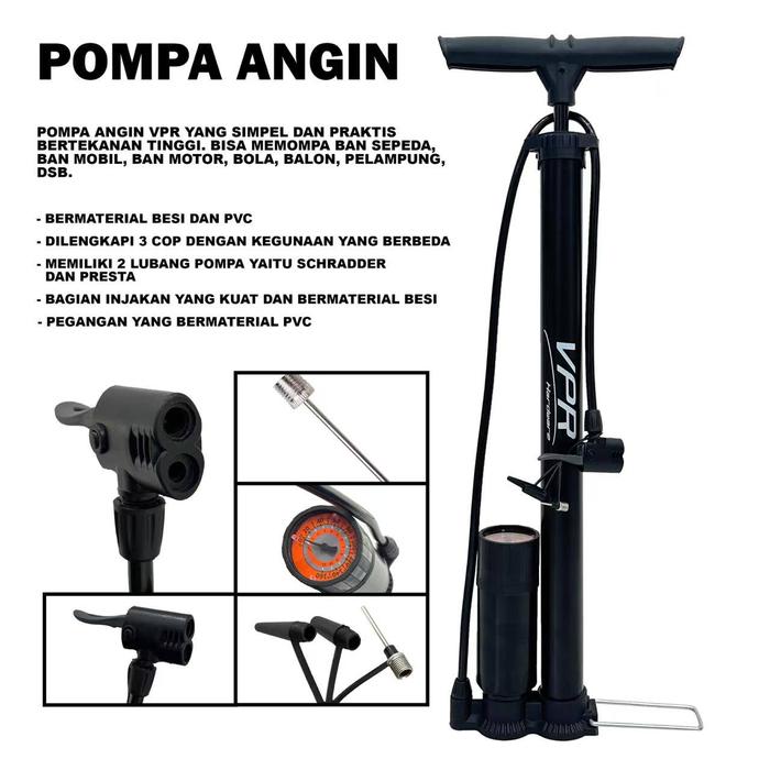 Pompa Angin Tangan VPR dirancang sebagai solusi lengkap dan portabel untuk mengisi udara pada berbagai keperluan. Dengan tekanan maksimal hingga 160 PSI (11 BAR), alat ini mampu mengisi ban sepeda motor, mobil, serta bola dan balon dengan cepat dan efisien. Tersedia dalam dua pilihan tinggi, 40cm dan 60cm, memberikan fleksibilitas sesuai kebutuhan pengguna.