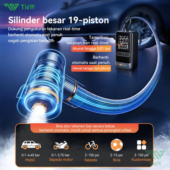 | Daya Hisap Kuat 80W | Tekanan maksimal 150 PSI dan aliran udara 35L/menit. Isi ban mobil kecil (0-35 PSI) dalam ~1 menit, ban mobil biasa dalam ~6 menit. |