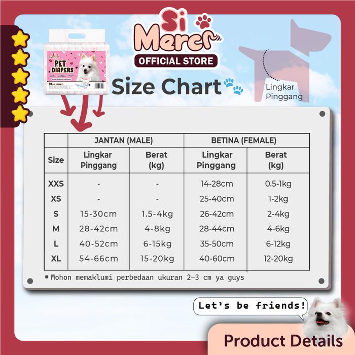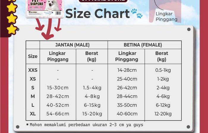 Catatan: Mohon maklumi toleransi ukuran ±2–3 cm. Pastikan mengukur lingkar pinggang anjing sebelum memilih ukuran.