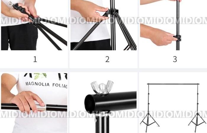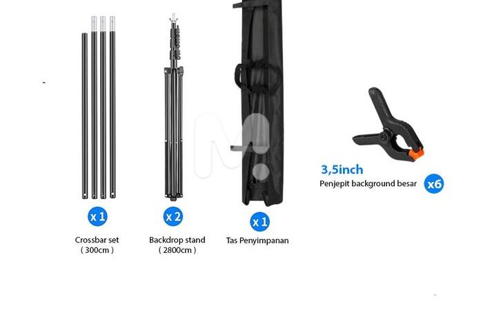 - Background Stand/Backdrop Stand: Sebuah penyangga atau rangka yang berfungsi untuk menggantung dan meregangkan kain background agar tidak kusut, sehingga menciptakan latar belakang yang rapi dan profesional untuk keperluan fotografi atau videografi.